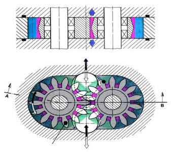 流量计腔体内有一对互相啮合的齿轮作为转子,两个齿轮与腔体可以分别构成一个固定的体积,称为标准容积、流量就是通过计算一定时间内来流通过标准容积的个数来计量。如下图:
