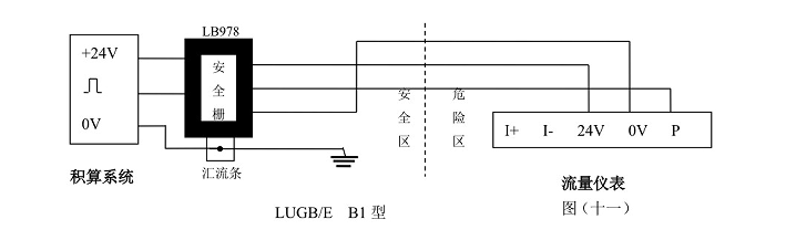 LUGB/E三线制脉冲输出型涡街流量仪表与LB978齐纳安全栅相连、LUGB/E两线制标准4~20mA电流输出型涡街流量仪表与LB987S齐纳安全栅相连可构成本质安全型防爆系统,产品防爆标志为Ex ia Ⅱ CT2-T5。本安防爆型涡街流量传感器/变送器与防爆安全栅和积算系统等关联设备的接线性请参看防爆安全栅厂家提供的接线说明和以下所示图(十一),图(十)。