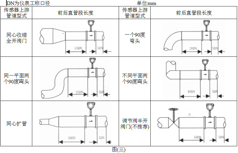 1. 涡街流量仪表对安装点的上下游直管段有一定要求,否则会影响介质在管道中的流场,影响仪表的测量精度。仪表的上下游直管段长度要求见图(三)