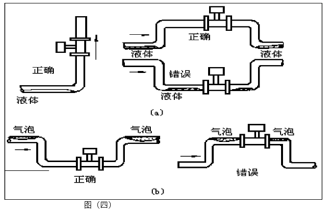5. 测量气体时,在垂直管道安装仪表,气体流向不限。但若管道内含少量液体,为了防止液体进入仪表测量管,气流应自下而上流动,如图(四)a所示